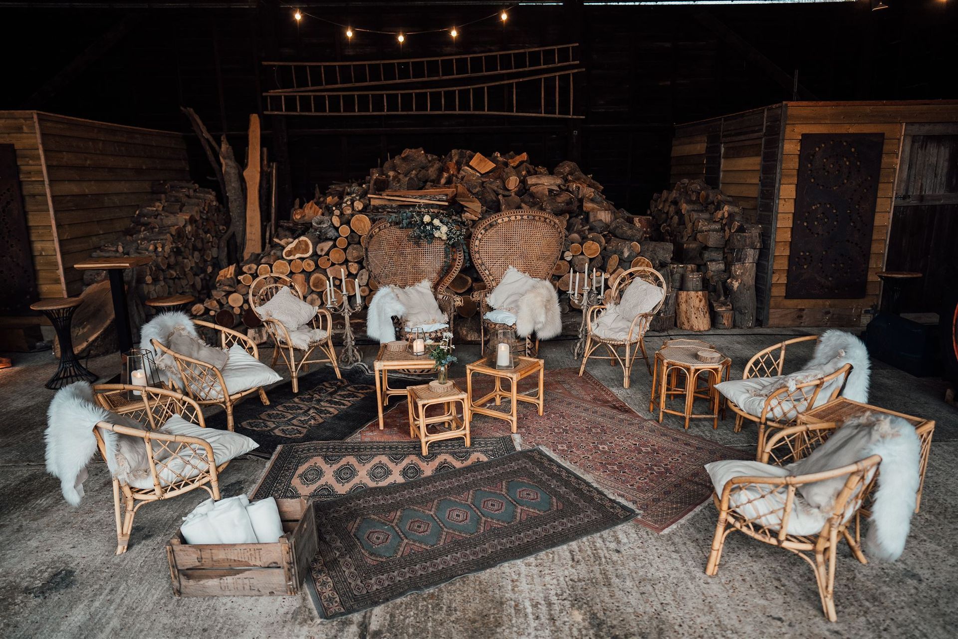 In our love of all things rustic and vintage, a set of world war II folding chairs and beautiful rustic tables form the heart of our collection. an eclectic selection of vintage sofas, armchairs, rugs and side tables add an additional touch of glamour to any event.
